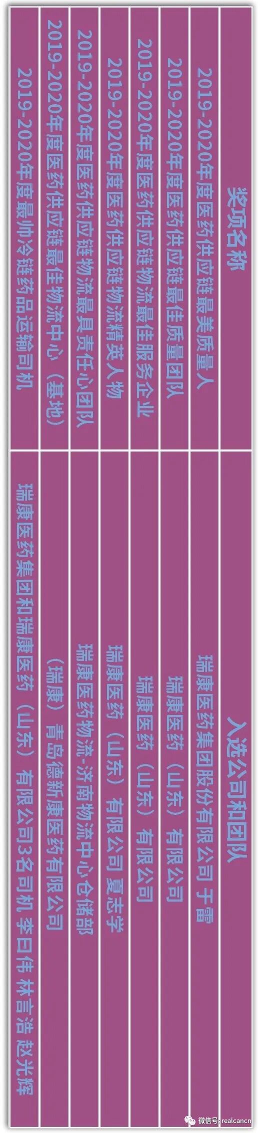 瑞康医药集团股份有限公司于雷获评2019-2020年度医药供应链最美质量人、瑞康医药(山东)有限公司获评2019-2020年度医药供应链最佳质量团队和2019-2020年度医药供应链物流最佳服务企业、瑞康医药(山东)有限公司夏志学获评2019-2020年度医药供应链物流精英人物、瑞康医药物流-济南物流中心仓储部获评2019-2020年度医药供应链物流最具责任心团队、(瑞康)青岛德新康医药有限公司获评2019-2020年度医药供应链最佳物流中心(基地)、瑞康医药集团和瑞康医药(山东)有限公司3名司机(李曰伟、林言浩、赵光辉)获评2019-2020年度最帅冷链药品运输司机。